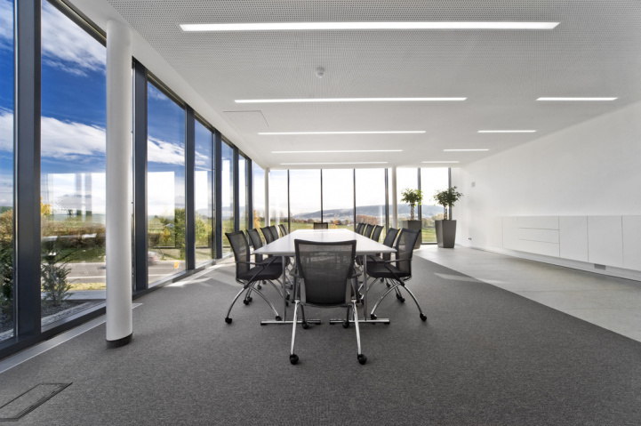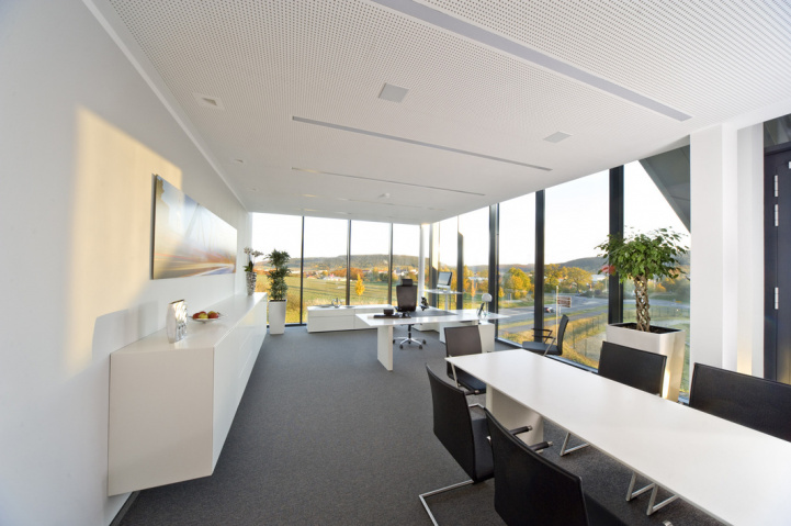 Die Innenarchitektur ist wie die äußere Gestalt klar, geradlinig und zweckmäßig und wartet mit ausgeklügelten manchmal auch unerwarteten Detaillösungen auf. Durch die bewusst gewählten freundlichen und zurückhaltenden Materialien wird ein angenehmes Arbeitsklima geschaffen, ohne dass sich unpassender kitschiger Elemente bedient wird.