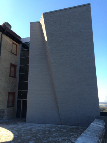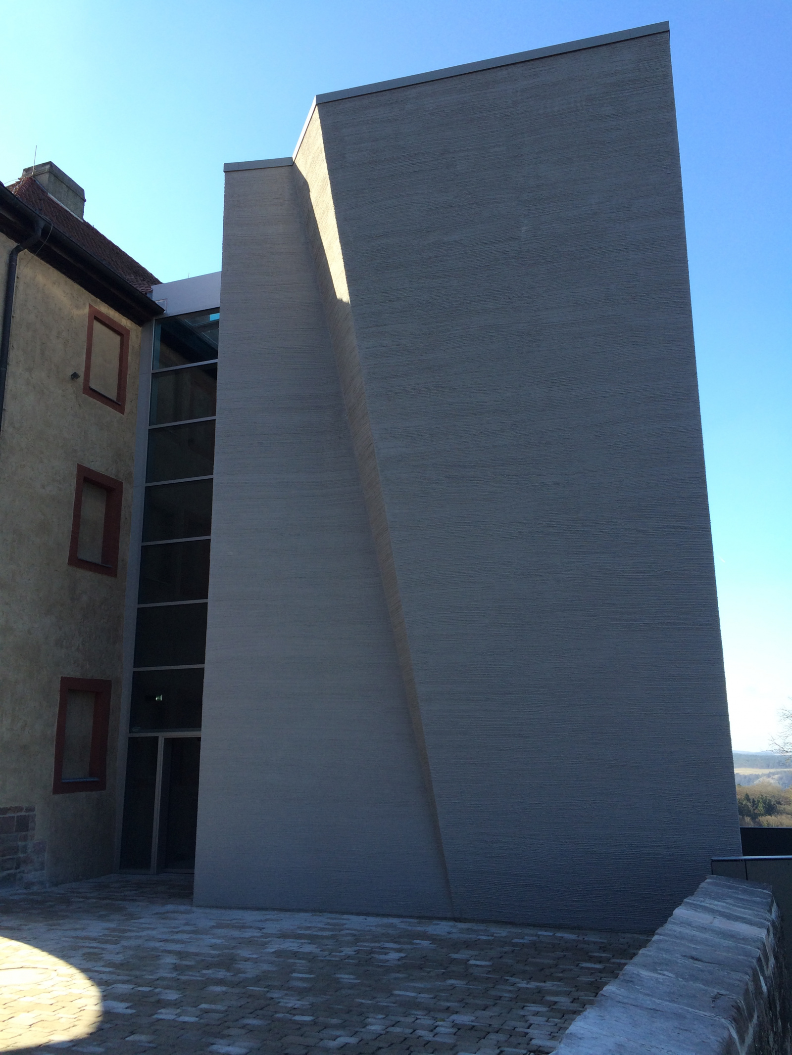 Die zur Verfügung stehenden Räume im bestehenden Logierhaus reichten für die Konzeption der Welten und zugehöriger Funktionsflächen nicht aus. So wurde das Gebäude aus dem Jahr 1720 an der Nordseite um einen neuen Anbau erweitert. In diesem konnten die noch notwendigen Räume an die Ausstellungskonzepte der Künstler angepasst werden. Er nimmt in seiner Ausdehnung und äußeren Form Bezüge zur alten Burgmauer und dem angrenzenden Logierhaus auf. Baufeld war eine sehr beengte Restfläche auf der Rückseite des Logierhauses welche von der umgebenden Burgmauer begrenzt wurde. Um die zur Verfügung stehenden Flächen voll ausnutzen zu können, passen sich die Außenkanten des Anbaus genau an die Kanten des alten Mauerverlaufes an und setzen diese nach oben fort. Dazu waren neben einer aufwändigen Bohrpfahlgründung auch Stabilisierungsmaßnahmen der Burgmauer notwendig. Die Fassade des Neubaus wurde als teils hinterlüftete, gedämmte Putzfassade ausgebildet. Kantigkeit und Geschlossenheit des Gebäudes spiegeln den abwehrenden Charakter der Burg wider. Putzstruktur und Farbigkeit nehmen Bezug auf die vorgefunden Fassaden der Leuchtenburg. In der Innenraumgestaltung ordnen sich Farben und Materialien einem übergeordneten Ausstellungskonzept unter.
