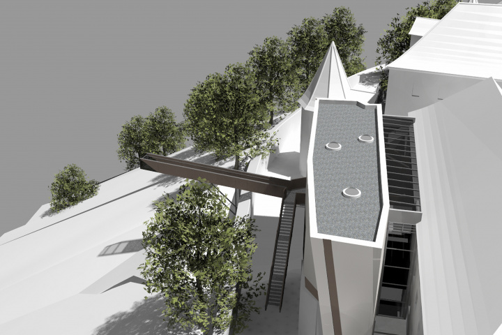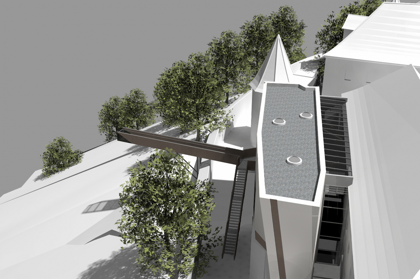 Zwischen Logierhaus und Nördlichem Anbau bildet eine gläserne Fuge das Bindeglied zwischen Alt und Neu. Diese Fuge leitet die Besucher ins Innere und dient den Porzellanwelten als logistisches Zentrum. Die schräg in der Fuge liegenden Verbindungsbrücken laden zum Verweilen ein und lassen immer neue Ein- und Ausblicke auf das Burgensemble frei werden. Darüber hinaus verbinden die Brücken die Ausstellungsbereiche, welche abwechselnd in Alt- und Neubau untergebracht sind. Das Ende, oder den Anfang der Ausstellung, bildet, je nach Betrachtungsweise, die „Welt der Wünsche“. Zu deren Konzeption gehört ein über die Burgmauer und den angrenzenden Hang hinausragender „Steg der Wünsche“. Der 20 m lange Steg wurde als Stahlfachwerk geplant, welches auf schräg verlaufenden Stützen aufgebaut ist. Die am Hang liegenden Fundamente wurden wiederum mit Kleinbohrpfählen gesichert. Um Schwingungen zu unterbinden wurde die Konstruktion zusätzlich abgespannt. Die äußere Bekleidung des Steges wird aus Faserzementplatten mit einer dezenten grau-braunen Färbung gebildet, welche auch an den weiteren neuen Bausteinen der Burg wiederzufinden sind. Somit sprechen alle neuen Gebäude auf der Leuchtenburg, trotz aller unterschiedlichen Ausprägung, eine einheitliche Architektursprache.