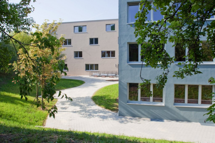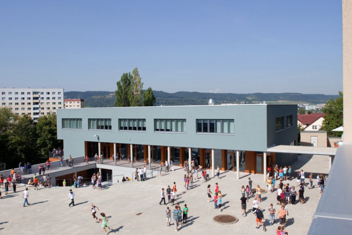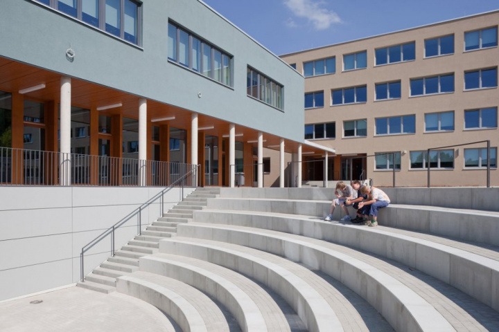 Der Typenschulbau aus den 1970er Jahren wurde erweitert und die Erschließung neu geordnet. Hier sind die Unterrichtsräume der Grund- und Regelschule untergebracht.