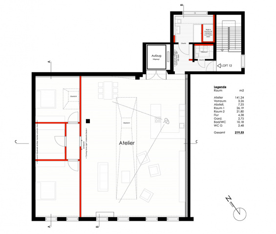 Die Einheit weisst derzeit nur wenige erhaltenswerte Eigenschaften auf. Der Parkettfussboden kann für die zukünftige Nutzung als Atelier wieder aufgearbeitet werden, wie auch der stillgelegte Aufzugszugang als gestaltgebendes Element erhalten bleiben kann. Die besondere Lage der Einheit unter dem Dach bietet jedoch große Chancen, räumliche und funktionale Mehrwerte zu generieren.