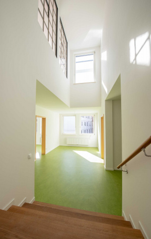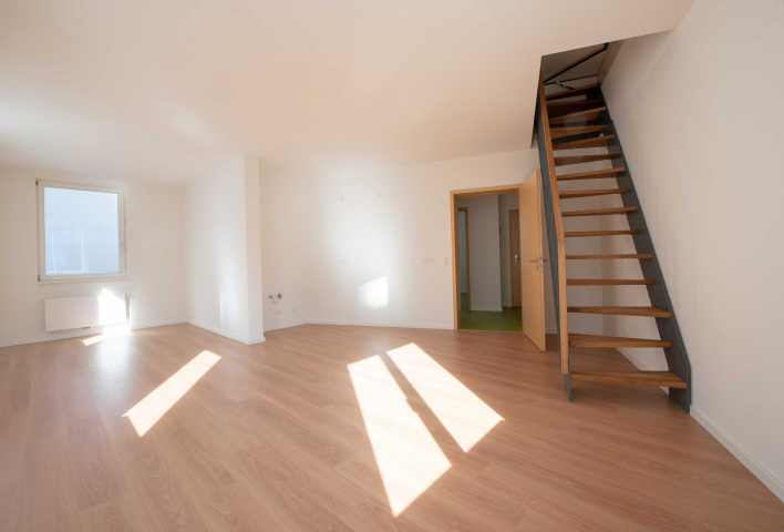 Wohnung A2: Wohnzimmer und Küche mit Aufgang zur Dachterrasse, Bild: Sascha Bühner -