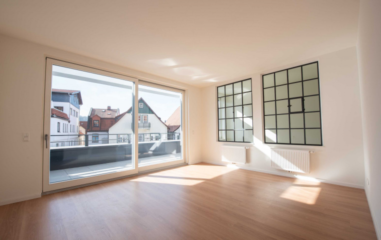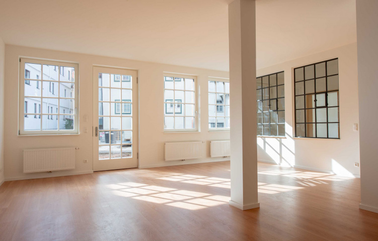 Loftwohnung A1: Wohnzimmer mit restaurierten Stahl-Glas-Fenstern aus der alten Druckerei, Bild: Sascha Bühner -