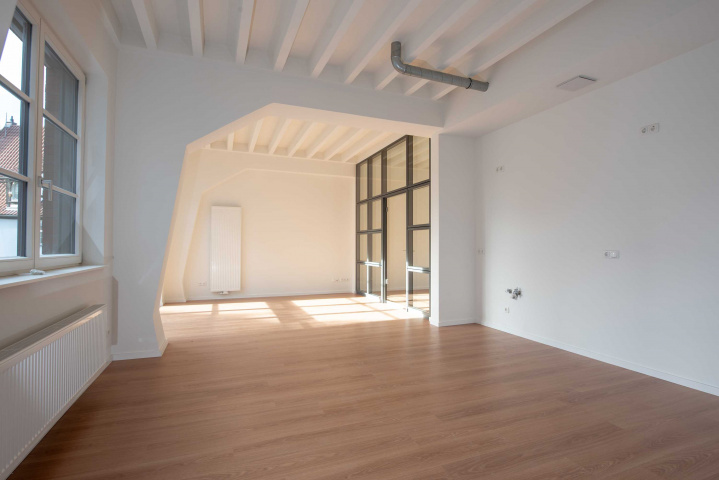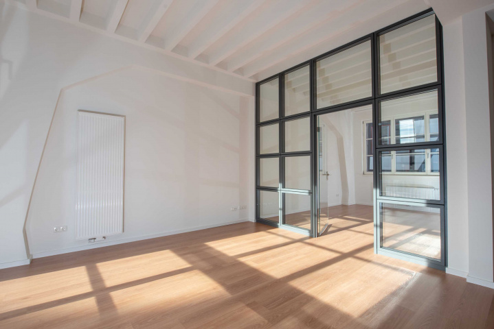 Loftwohnung A3: Wohnraum über zwei Etagen mit restaurierten Stahl-Glas-Fensterelementen aus der alten Druckerei, Bild: Sascha Bühner -