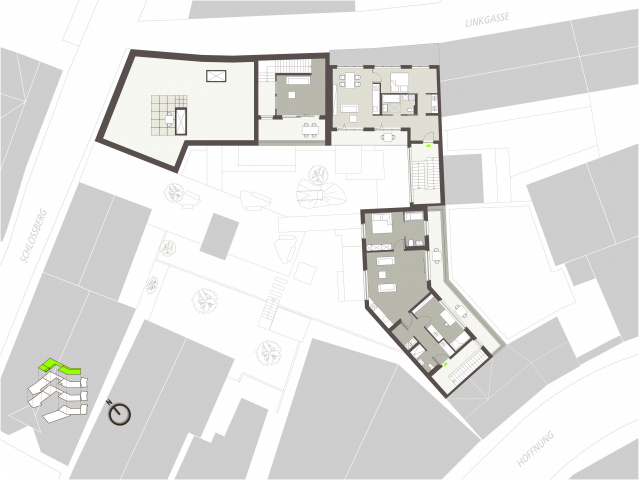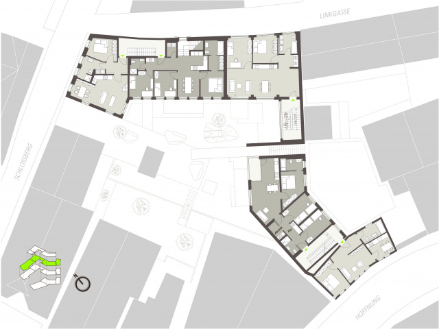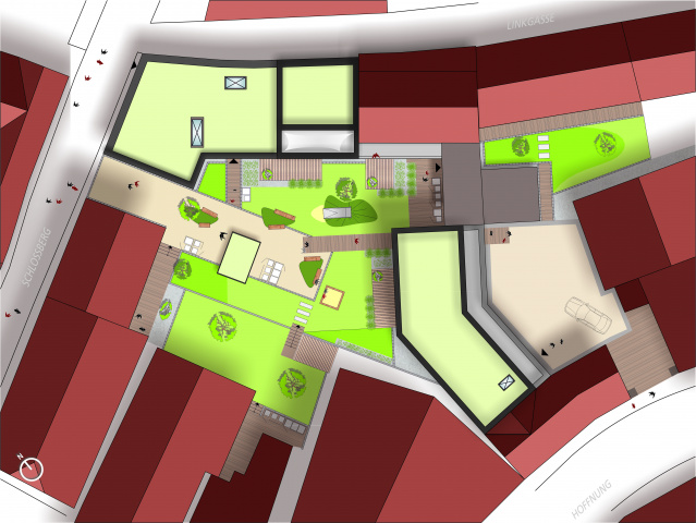 Vier Häuser bilden mit der umliegenden Bebauung zwei Innenhöfe. Im Westen den „grünen“ mit Aufenthaltsqualität und im Osten den „urbanen“ als Zufahrt zur Tiefgarage. Die 1- bis 4-Raum-Wohnungen überzeugen durch fließende Raumgestaltung, Material- und Farbgebung. Jede Wohnung verfügt über eine ebenerdige Terrasse, Loggia oder Dachterrasse.