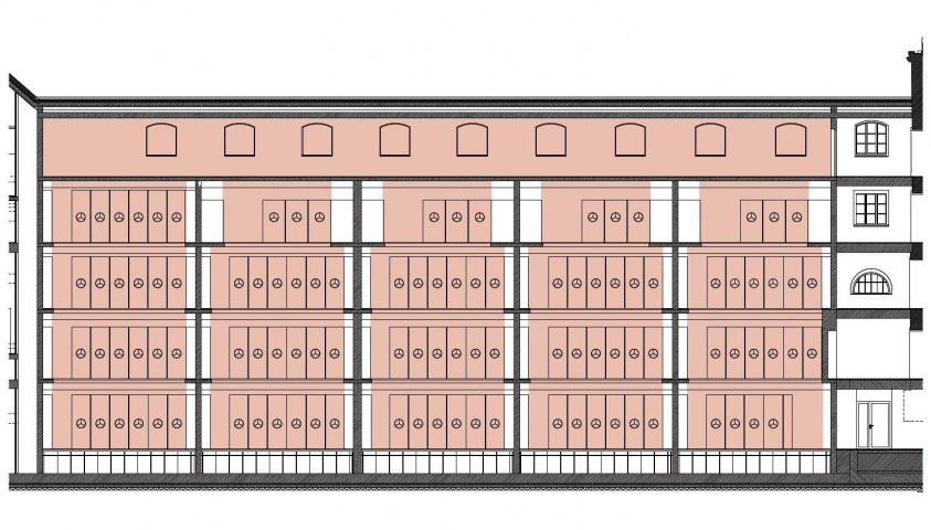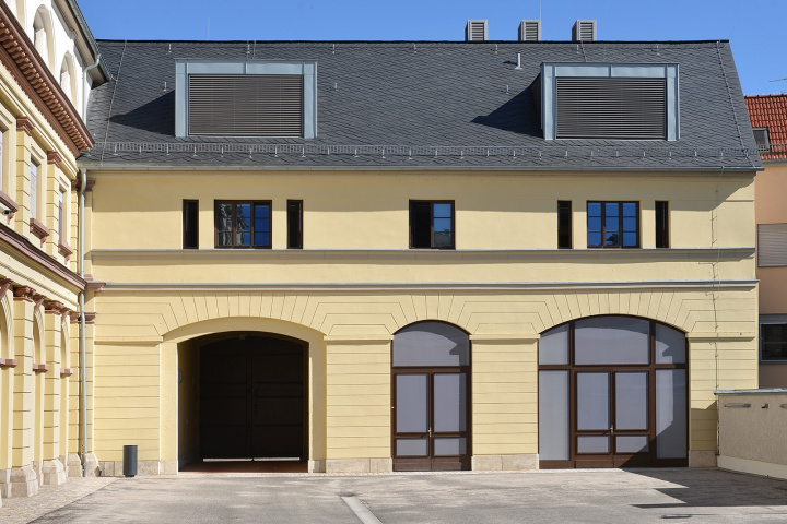 Die denkmalgerechte und behördlich konsensfähige Entscheidung fiel deshalb zugunsten eines neuen Kellergeschosses auf Niveau des Tiefmagazins Marstallhof (2.BA). Aus dem unumgänglichen Rückbau der DDR-Stahlbetonkonstruktionen im Inneren entstand die Idee einer Haus-in-Haus-Lösung zur Errichtung eines fünfgeschossigen Magazinblocks vom Keller bis unter die Dachschrägen. Die fünf vollklimatisierten Magazin-Geschosse mit Kompaktregalanlagen (16 Regal-km) werden über zwei flankierende Treppenhäuser erschlossen und verfügen über niveaugleiche Anbindungen in alle Arbeitsbereiche der Archivare im Marstallquartier. Die Binnenstruktur des Magazinblocks wurde nach einem Variantenvergleich der Brandgefährdungsgrößen für Archivgut ermittelt und bauphysikalisch so wie brandschutztechnisch optimiert. Daraus resultiert eine Segmentierung in fünf vertikale Magazineinheiten, deren Luftverbund über begehbare Deckenroste hergestellt wird. Im Brandfall wird das betroffene Magazinsegment separiert und über eine Dachgeschossgalerie der Hofseite entraucht. Außenwände und Fassaden wurden in situ erhalten und das Gesamterscheinungsbild des Neorenaissance-Gebäudes restauratorisch wiederhergestellt.