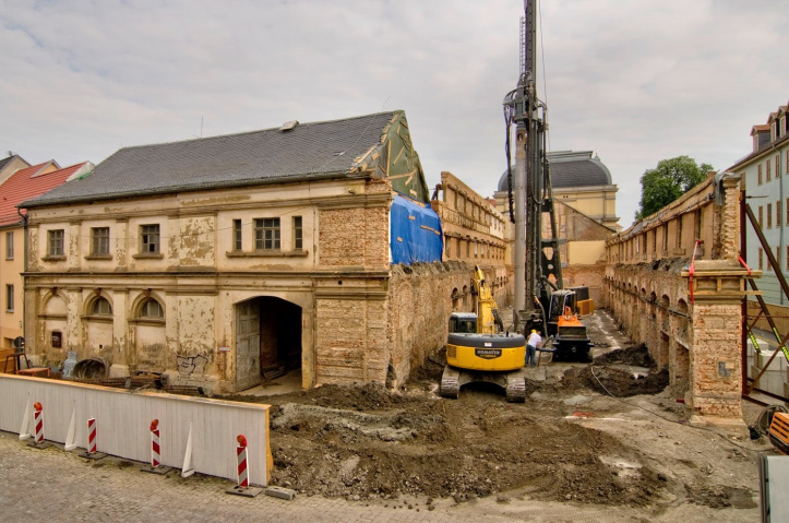 Baugeschichtlich war der Nördliche Westflügel des Marstallquartiers (C.H.F. Streichhan -1878) mehrfach schadhaften Störungen und Eingriffen ausgesetzt. Ohne ausreichende Traglastreserven für die Magazinfunktion wurden in den 1960er Jahren fast alle Innendecken und -stützen komplett in Stahlbeton ersetzt. Allein die Baugrundsituation hätte eine flächendeckende Nachgründung mit immensen Aufwendungen erfordert.