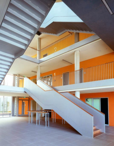 Die Besonderheit des Entwurfs besteht zum einen in der Schaffung von neuen Raumqualitäten (Erschließungshalle, Lichthof, Fachkabinette, grüne Klasse, Aula und Speisesaal), zum anderen in der Neuordnung von Erschließungswegen einschließlich des ebenerdigen Eingangs und des barrierefreien Zugangs aller Ebenen bei minimaler Verkehrsfläche.
