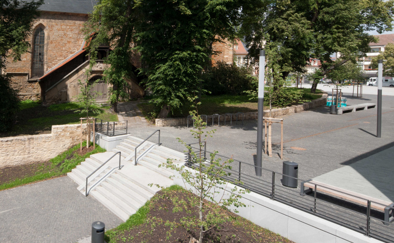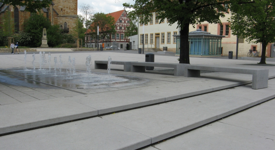 Der zentrale Platzteil erhielt eine moderne Gestaltung mit großformatigen Betonplatten. Diese zeitgemäße Interpretation wurde eingebettet in das klassische Ambiente der Stadt Sömmerda und den historischen Stadtboden. Ein großzügiges Wasserspiel sorgt für den belebenden Akzent. Der vorhandene Baumbestand wurde in der Planung berücksichtigt und weitgehend erhalten. Die Mauern des Kirchhügels wurden saniert und einbezogen.