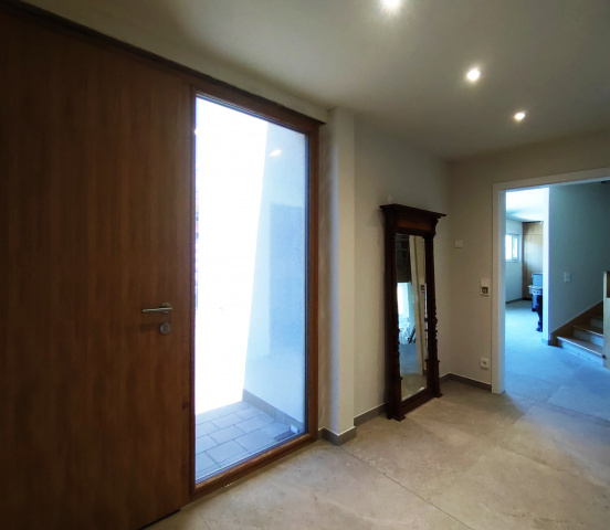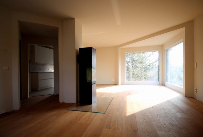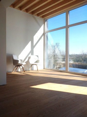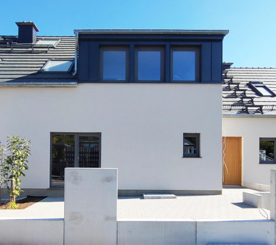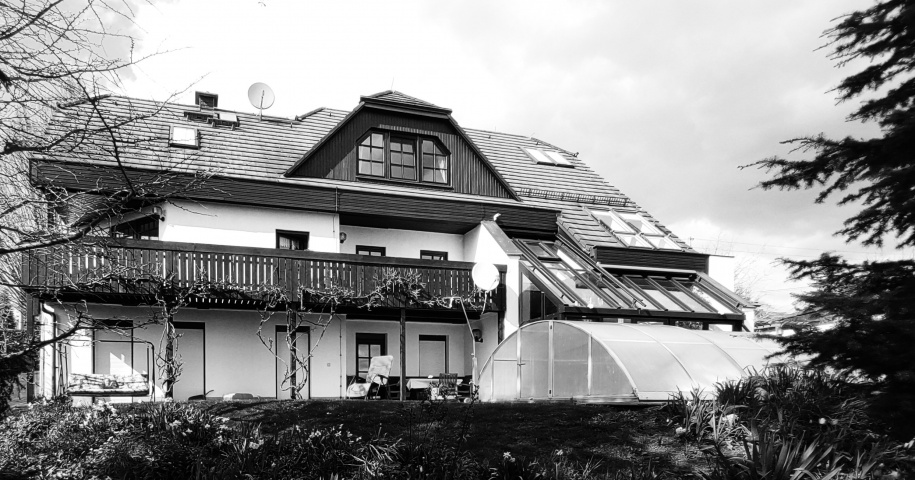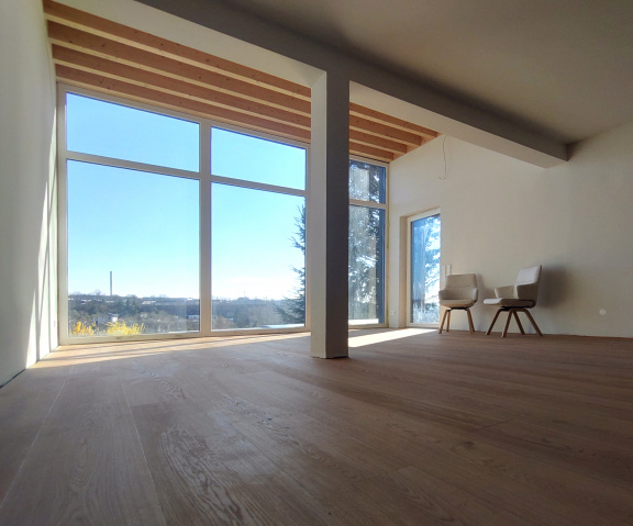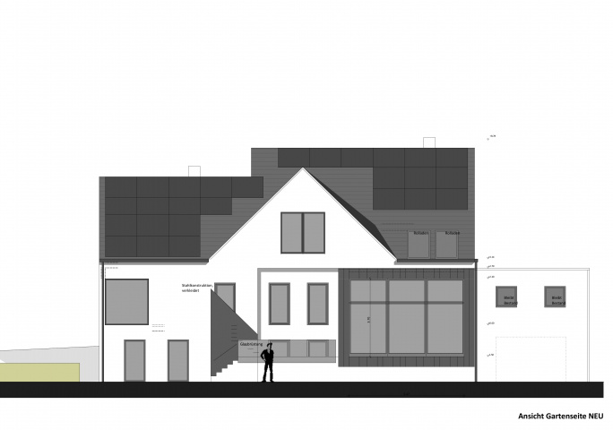 Umgeben von Natur und Erholung liegt in Hanglage das Wohnhaus - welches zukünftig als Generationenwohnhaus seinen Bewohnern einen einzigartigen Kompfort bietet. Das Anfang der 1990er Jahre im Bereich eines älteren Wohnhauses errichtete Gebäudes in Holzrahmenbauweise musste an die Bedingungen unserer Zeit angepasst werden. Da die bestehende Ölheizung gegen eine effiziente Wärmepumpe mit Photovoltaik getauscht werden musste wurde eine energetische Sanierung des gesamten Hauses notwändig. Die 20cm Außenwände mit ca. 10cm Wand- und Zwischensparrendämmung des Daches machten die Ertüchtigung notwendig. Vorsprünge, Gauben, Dachform und Fassadengestaltung wurden verändert - jedoch mit Einsatz von wenigen Mitteln. Der neue Eindruck - ein komplett anderer. Zeitgemäß, großzügig. Würdevoll. Ohne die Neuversieglung und das Optimieren der bestehenden Strukturen konnte das im "Splitlevel" errichteten Hauses barrierearm umgestaltet werden. Eine neue Gaube an der Eingangseite so wie die Veränderung der Schrägdachverglasung an der Gartenseite schufen neue, großzügige Räume mit überraschendem Raumgefühl. Eine Gemeinschaftsterrasse sorgt künftig für einen Treffpunkt - mit wunderbarem Blick.