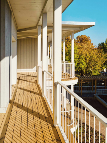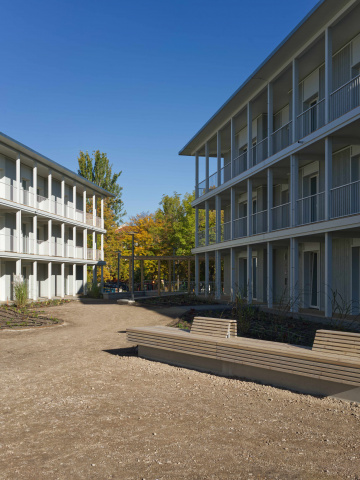 Die freie Komposition aus den drei schlanken Holzbauten mit ihren signifikanten, umlaufenden Loggien umfasst einen gemeinschaftlichen, halböffentlichen Garten. Die Loggien bestimmen den Ausdruck der drei Wohngebäude und bieten eine Verbindung zwischen privatem Wohnraum und dem halböffentlichen Hofraum des Mehrgenerationsquartiers.