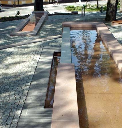 Durch die Hanglage und dem dominierenden vorhandenen Gehölzbestand ergeben sich Terrassenflächen zwischen Höhensprüngen, die mit Treppen überwunden werden. Mittig werden in Hauptlaufrichtung Wasserspiele angeordnet.