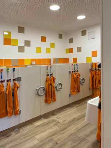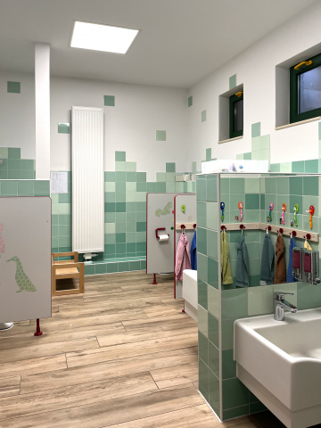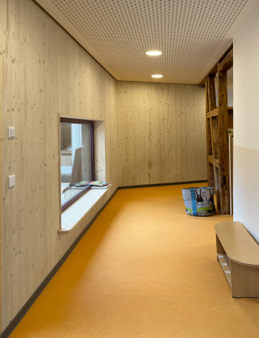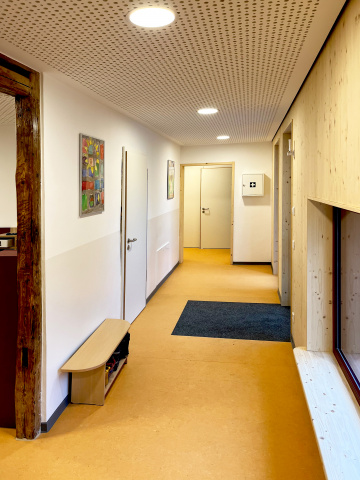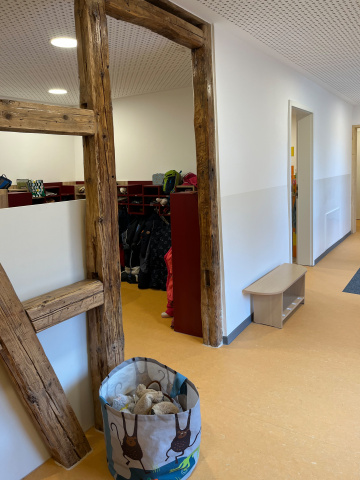 Der 2. Bauabschnitt umfasste die Entkernung des erdgeschossigen Verbindungsbaukörpers zwischen Altbau und dem hofseitigen Anbau aus 2006. Nach der Entkernung wurde ein neuer Verbindungsbaukörper in nachhaltiger Holzbauweise vorgebaut und alles auf den neusten Stand der Technik ausgebaut. Im Sanierungs-/Ausbaubereich wurde ein neues Kinderbad, eine Gästetoilette, ein Waschmaschinenraum, eine zentrale Garderobe und ein großzügiger Spielflurgang mit Sitzfenster zum Hof erstellt. Alle Bereiche erhielten Schallschutzdecken und eine kindgerechte Ausstattung.