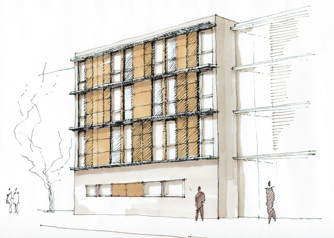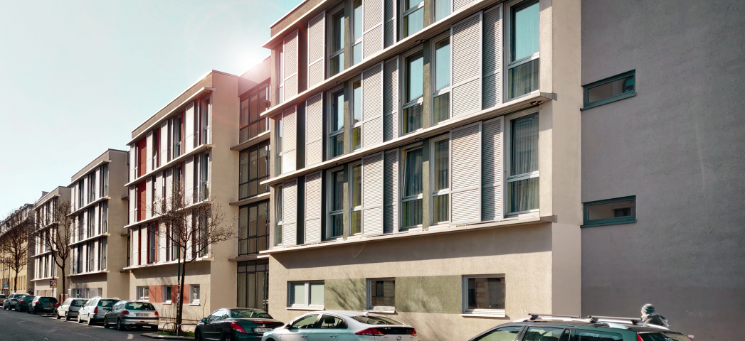 Hinter dem Gebäude wurde eine großzügige Hofsituation mit Integration der umliegenden Bebauung geschaffen. Der lange Baukörper wurde in vier gleichförmige "Bausteine" gegliedert, die durch Einschnitte und Farbe voneinander getrennt sind.