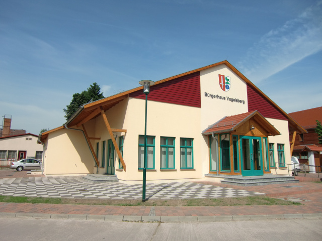 Der Gemeinde Vogelsberg fehlte für ihre rege Vereinstätigkeit und für größere Veranstaltungen schon seit langem ein Ort der Begegnung mit einer ausreichend großen Nutzfläche. Nachdem mitten im Ort eine Fläche von baufälligen Gebäuden freigeräumt werden musste, nutzte die Gemeinde die Gelegenheit den Neubau eines Gemeindesaales ins Dorferneuerungsprogramm aufzunehmen. Das realisierte Bauvorhaben besteht aus einem Gebäudehauptkörper, dem Gemeindesaal, und den beidseitig symmetrisch integrierten Nebenfunktionsräumen, die die Toilettenanlagen und die Technikräume beherbergen. Die tragende Konstruktion wurde mit Stahlbetonstützen realisiert, die im Rechteck aufgestellt wurden und durch einen umlaufenden Stahlbetonringbalken stabilisiert wurden. Auf diesem Ringbalken wurden die Satteldach-Nagelplattenbinder im Abstand von einem Meter gesetzt. Die Außenwände wurden mit Gasbetonsteinen errichtet.Die Nutzfläche des Saales beträgt 217 qm und ist für max. 300 Personen ausgelegt.