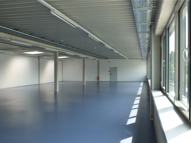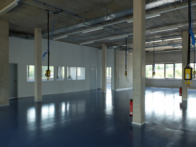 Das Gebäude besteht aus einem mittig positionierten Erschließungstrakt und zwei Produktionsflügel. Der Erschließungstrakt beinhaltet Eingänge von der Nord- und Südseite sowie vom Parkdeck. Er dient der vertikalen Erschließung des Gebäudes. Mit der zusätzlichen Funktion als Verbinder der beiden Gebäudeflügel übernimmt er die Hauptverkehrsfläche. Dadurch erhalten die Produktionsflächen in den Flügeln einen offenen Grundriss, der eine ständige Optimierung der Produktionsabläufe ermöglicht.