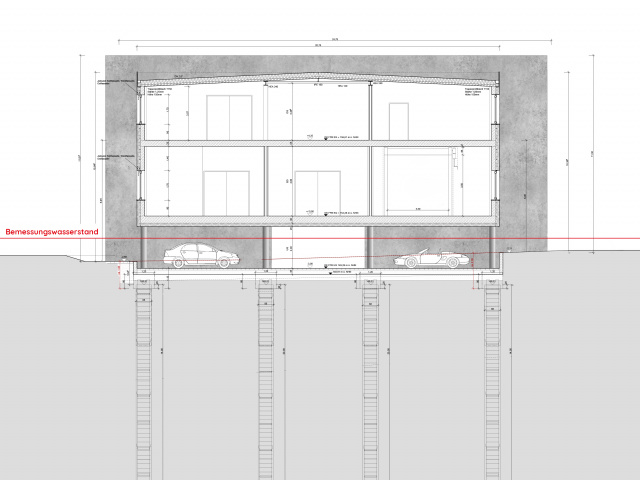 Aus der Notwendigkeit, die Gebäudesubstanz über dem Bemessungshochwasserstand zu setzen, ergibt sich das schwebende Erscheinungsbild der Gebäudeflügel. Daher gibt es auch kein herkömmliches Erdgeschoss.