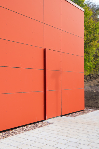 Mit dem zunächst verschlossenen Fassadenkleid aus farbigen Faserzementtafeln wird der exponierten Lage des Gebäudes Rechnung getragen. Mit Nutzung treten großzügige Verglasungen in Erscheinung, welche mit horizontal verschiebbaren Faltschiebläden abgedeckt sind.