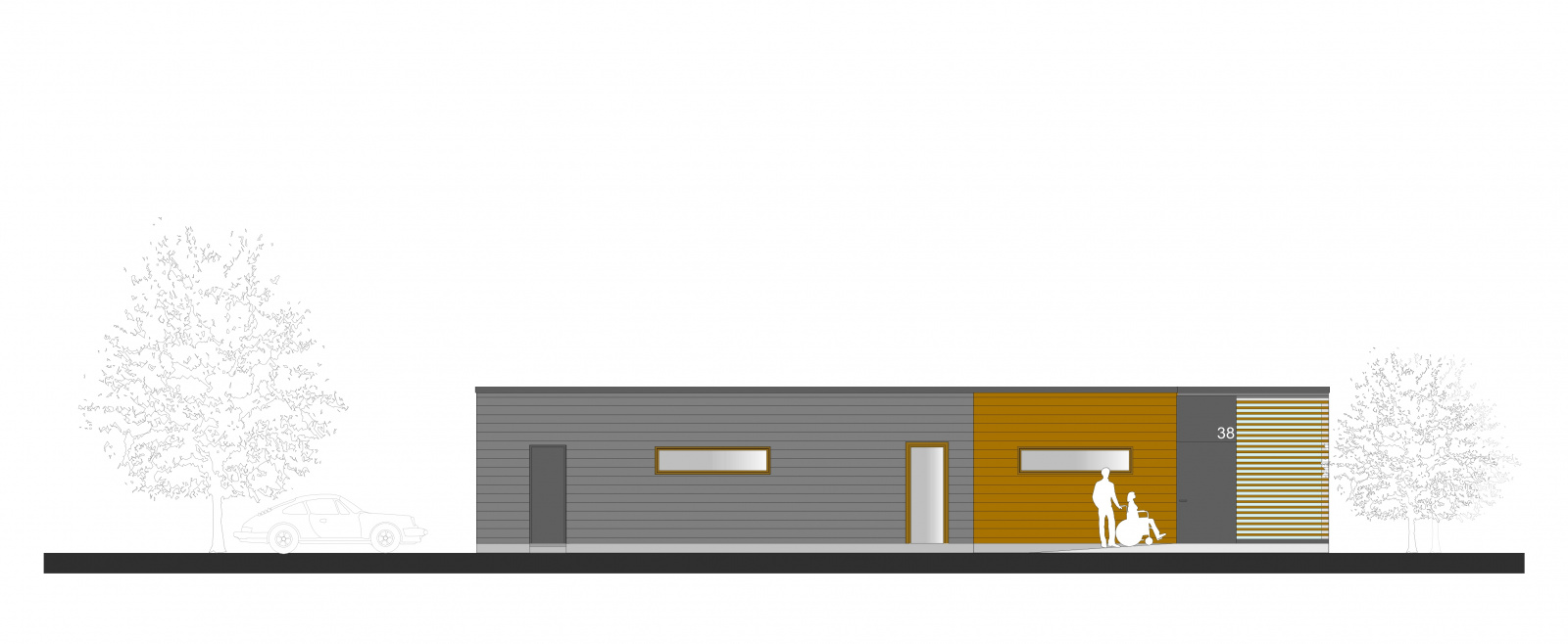Die Fassade schließt sich schützend zur Straße hin und hat ihre Orientierung durch große, offene Fensterflächen in den Garten hinein. Die Außenwand ist mit einem sägerauen Nut und Feder- Fassadenprofil verkleidet und lässt durch seine Farbgebung ein elegantes Wechselspiel zwischen Hauptbaukörper und Anbauten zu.