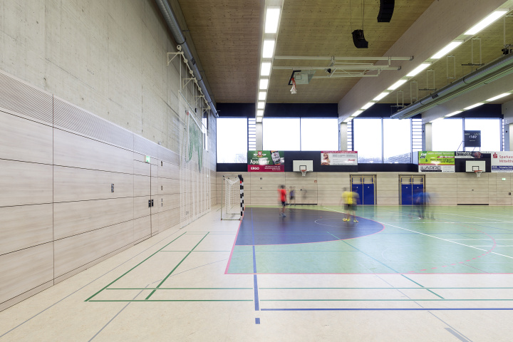 Die Dreifeldsporthalle ist Teil des neuen Sportkomplexes an der Adolf-Aber-Straße. Sie soll für Schul- und Vereinssport - aber auch als Veranstaltungsort genutzt werden, z. B. während der Landesgartenschau 2017. Die Halle präsentiert sich zum Festplatz hin mit einer großflächigen Glasfassade. Dach und Giebel bilden den Rahmen, unter dem die Funktionen zusammengefasst werden. Ein Foyer empfängt die Besucher und leitet in die Halle bzw. ins Obergeschoss weiter, in dem sich die Tribünen, ein Vereins- und ein Multifunktionsraum befinden. Da der Baukörper in den anstehenden Hang geschoben wurde, kann die Tribünenebene auch direkt von der Südseite aus erschlossen werden. Die Halle wurde in Stahlbetonbauweise errichtet. Leimholzbinder tragen das extensiv begrünte Dach.