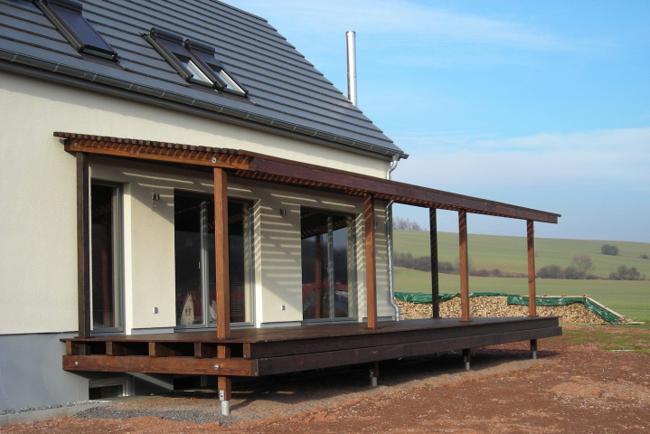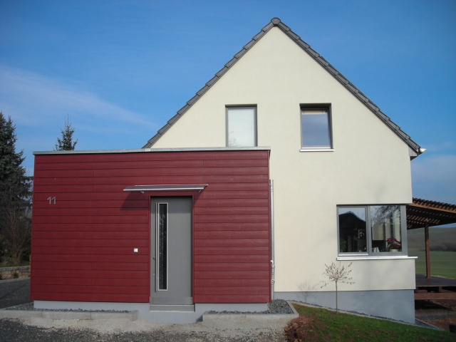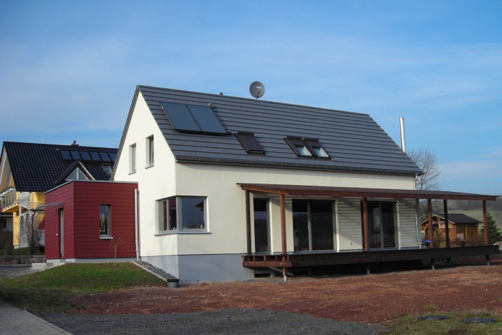Auf einem Baugrundstück am Ortsrand von Herreden, westlich von Nordhausen gelegen, entstand ein Einfamilien-Wohnhaus mit einer Wohnfläche von ca. 130 m² für 3 Personen. Das vorhandene dörfliche Umfeld ist gekennzeichnet von einzelstehenden und kleinteiligen Wohnhäusern aus den 1940er Jahren, die in stenger Straßenflucht angeordnet sind. Realisiert wurde das Einfamilien-Wohnhaus ebenso in dessen vorhandener Straßenflucht in Niedrigenergiebauweise mit moderner und zeitgemäßer Architektur. Mit dem Satteldach und der schlichten Putzfassade des Hauptgebäudes, mit der Stülpschalung des Büroanbaus sowie mit den Holzmaterialien der südlichen Terrassenkonstruktion wird die dörfliche und regionale Formensprache akzeptiert und beibehalten.