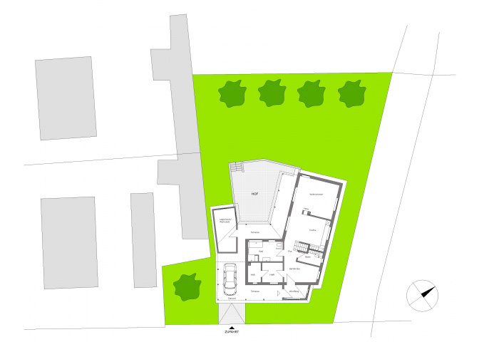 Das trapezförmige Grundstück mit seiner kurzen straßenseitigen Grundstücksbreite und die Ansprüche der Bauherren an das Raumkonzept bedurften einer individuellen Planung. Das über Eck angelegte zweigeschossige Hauptgebäude (36,5er Porotonziegel) mit seinem kurzen zur Straßenseite orientierten und langen an der Grundstücksgrenze entwickelten Flügel öffnet sich zum Inneren des Grundstückes. Das Hauptgebäude wird an der Ost-, Süd- und Westseite von einer Überdachung (Holzbau) umschlossen. Unter dieser befinden sich der östliche Windfang/Eingangsbereich, das Carport, die Werkstatt und die Terrassenflächen. Zwischen der Werkstatt und dem Hauptgebäude gibt es einen Durchgang, der auf einen kleinen, beruhigten Hof führt. Im Erdgeschoss befinden sich offene Wohnbereiche. Das Dachtragwerk ist durch eine Aufsparrendämmung im gesamten Dachgeschoss sichtbar.