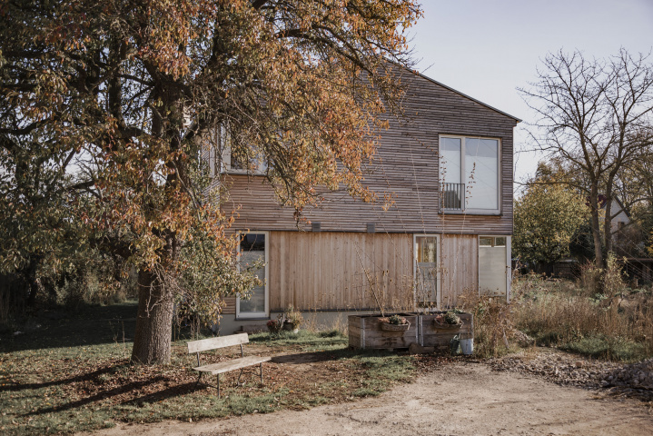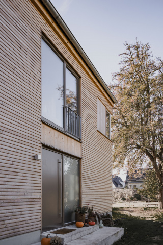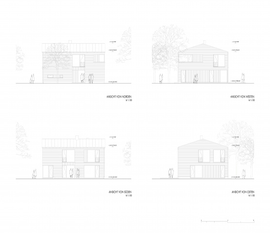 Der Entwurf des Wohnhauses sieht eine zweigeschossige Holzständerbauweise mit knappem Satteldach und einer Fassade mit Sichtschalung aus unbehandeltem Lärchenholz vor. Der auf einem rechteckigen Grundriss beruhende kompakte Baukörper ist, dem Anliegen entsprechen zu wollen, den vorhandenen Baumbestand (v.a. alter Nussbaum im Nordwesten) möglichst nicht zu beeinträchtigen, tief in das bestehende, im Norden Bad Langensalzas an einer Straße gelegene gewachsene Gartengrundstück eingeschoben.