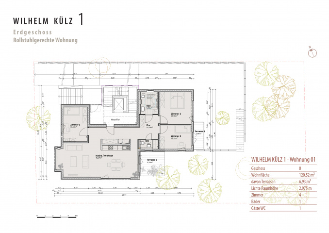Eine großzügige Eingangsdiele dient als Empfangsbereich und „Verteiler“ in die angrenzenden Wohn- und Rückzugsbereiche. Wohnraum, Küche und Essplatz sind als fließender Raum konzipiert und von drei Seiten belichtet.