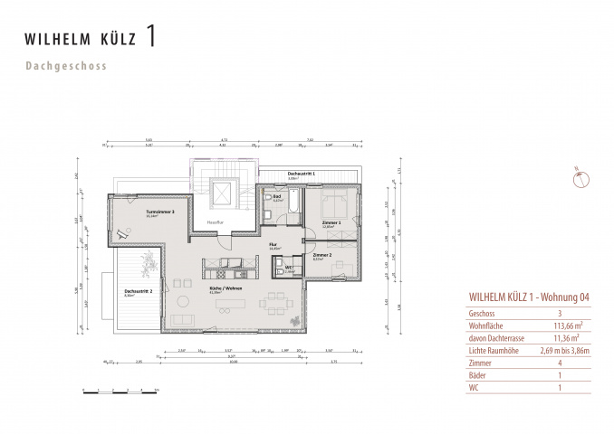 Im EG, 1. und 2. OG sind diesem Raum Balkone bzw. Terrassen auf der Gartenseite zugeordnet. Im Dachgeschoß befindet sich eine Terrasse westseitig am Wohnraum. Die Rückzugsbereiche aller Etagen befinden sich vorrangig an der Gartenseite des Gebäudes.