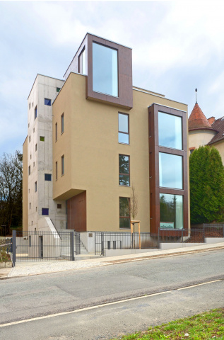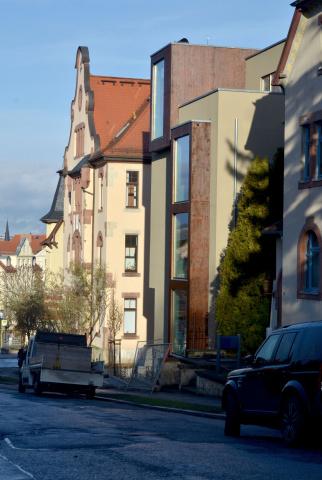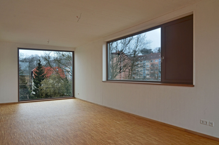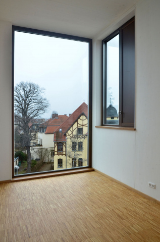 Das neue Mehrfamilienhaus in massiver Holzbauweise nimmt die höhenmäßige Vermittlung zwischen dem Eckgebäude Cranachstraße und der eklektizistisch anmutenden Villa wieder auf und übersetzt architektonische Zitate des Denkmalensembles Südstadt in eine zeitgemäße Architektursprache. Das dreigeschossige Holzhaus besitzt ein 4. Staffelgeschoss mit Ateliercharakter, welches im Südviertel Weimars seit der Eröffnung der Großherzoglichen-Sächsischen Kunstschule ortstypisch war.
