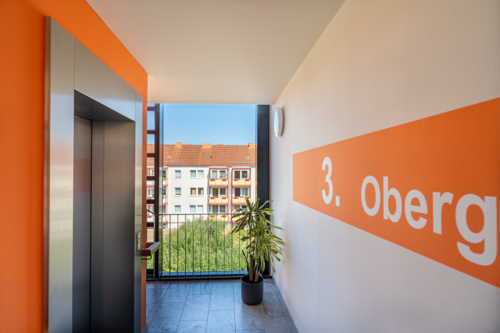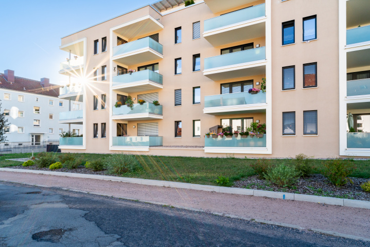 Der 4- geschossige Baukörper mit Tiefgarage und Staffelgeschoss zeichnet sich durch eine moderne, familienfreundliche und barrierefreie Architektur mit 2-, 3- und 4- Raumwohnungen aus. Alle Wohnungen besitzen großzügige Balkone und sind mit einem Aufzug über alle Etagen erreichbar. Das Dachgeschoss wurde als Staffelgeschoss mit großflächiger Dachterrasse und attraktivem Blick in die Stadtmitte und ins Umland ausgeführt.
