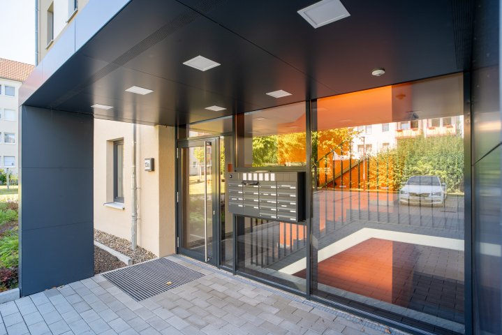 Eingangsbereich mit Briefkastenanlage und Vordach, Bild: Axel Bauer (formplus) -