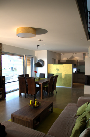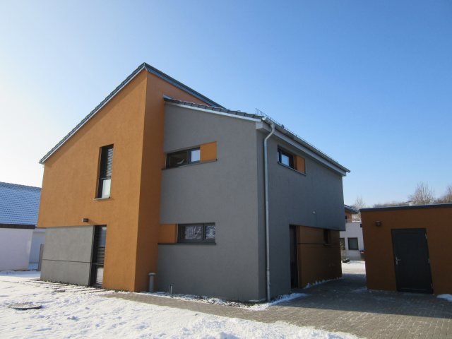 Am westlichen Stadtrand von Nordhausen entstand für ein Ehepaar ein modernes Einfamilien-Wohnhaus mit Doppelgarage und großzügigem Gartenbereich. Das zweigeschossige Wohnhaus mit einer Wohnfläche von ca. 150 m² beinhaltet im Erdgeschoss eine offene Grundrißstruktur für das Wohnen, während im Obergeschoss die privaten Räume angeordnet sind. Wesentlich für die moderne und zeitgemäße Baugestaltung sind großflächige Verglasungen im Erdgeschoss, die Ein- und Ausblicke in den Garten- und Terrassenbereich zulassen. Ein großzügiger Eingangsbereich auf der Straßenseite mit Überstand und seitlichem Kücheneckfenster wirkt einladend und schafft die von den Bauherren gewünschten Sichtkontakte zwischen Besucher, Nachbarn und Bewohner.