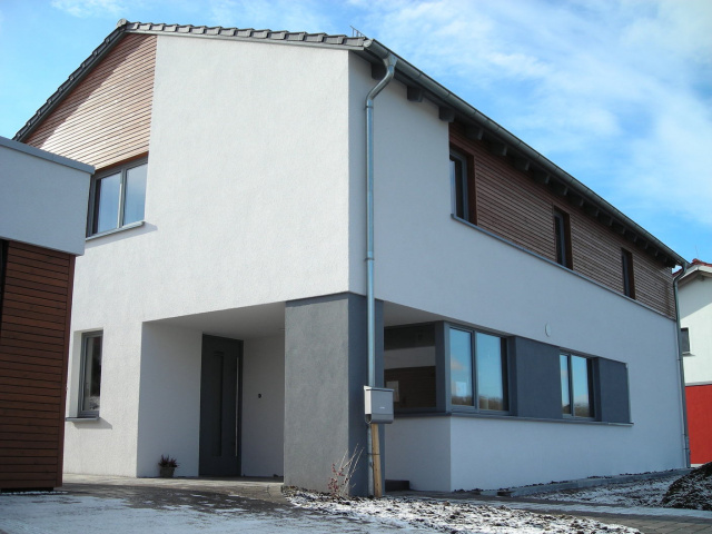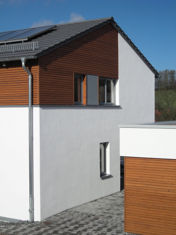 Nördlich am Stadtrand von Nordhausen entstand in einem Wohngebiet für eine vierköpfige Familie ein Wohnhaus mit einer Wohnfläche von circa 216 m². Realisiert wurde für die Familie ein großzügiges und modernes Raumkonzept mit den Bereichen Wohnen, Kochen und Essen im Erdgeschoss und den privaten Räumen wie Bad, Kinder- und Schlafzimmer im Obergeschoss. Ausgeführt wurde das zweigeschossige Wohnhaus sowie die angrenzende Doppelgarage in zweitgemäßer und moderner Architektur. Der kubische Baukörper mit flach geneigtem Satteldach ist gegliedert in verputzte Fassadenteilen und Flächen aus Holzleistenschalung. In gleicher Gliederung und Ausführung der Fassade wurde auch die Doppelgarage gestaltet, um eine einheitliches und zusammenhängendes Gesamtbild der Gebäudegruppe zu erhalten.
