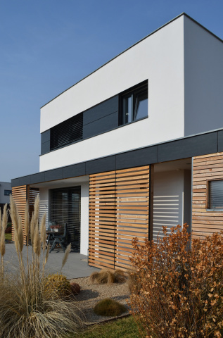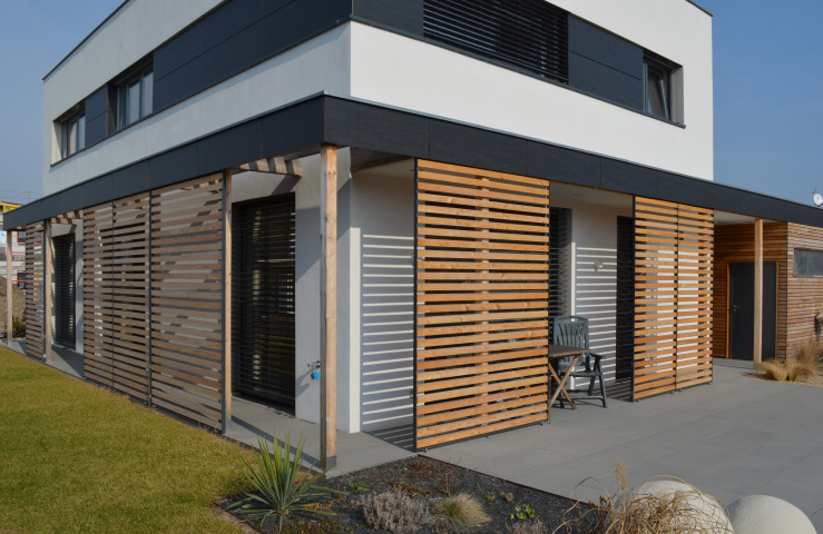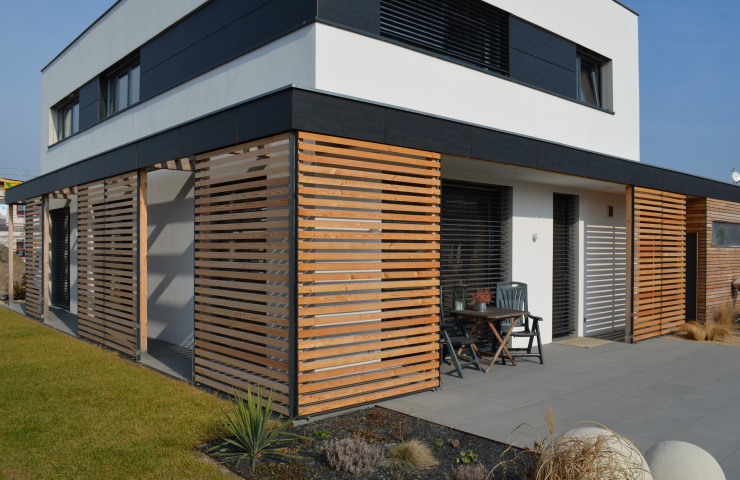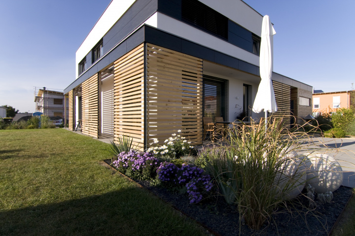 Eine klare Entwurfslinie verbindet sich mit der natürlichen Farbgebung der Lärchenhölzer und dem sandfarbenen Außenputz. Eine umlaufende Pergola, ist Rückzugsbereich, Sonnenschutz und gestalterisches Element. Die beweglichen Sonnen- und Sichtschutzelemente können den Bedürfnissen angepasst werden. Eine strukturierte Gartengestaltung unterstützt das harmonische Gesamtbild. Große Südfenster zum Garten verbinden innen und außen, dabei erzeugt die Pergola ein spannendes Licht- und Schattenspiel. Auch im Innenraum wurde eine funktionale Gestaltung mit natürlichen Elementen verbunden. Flächenbündige Einbauten kommen im 3m hohen Erdgeschoss, mit Echtholzparkett und Naturstein zur Geltung. Bereits im Entwurf wurde neben der modernen Gestaltung auch auf einen niedrigen Energieverbrauch und eine wirtschaftliche Bauweise geachtet. Eine lückenlose Dämmung der Gebäudehülle und die südliche Ausrichtung der Fenster sparen Energie. Zusätzlich reduziert eine Solaranlage den Verbrauch der Gas-Therme.