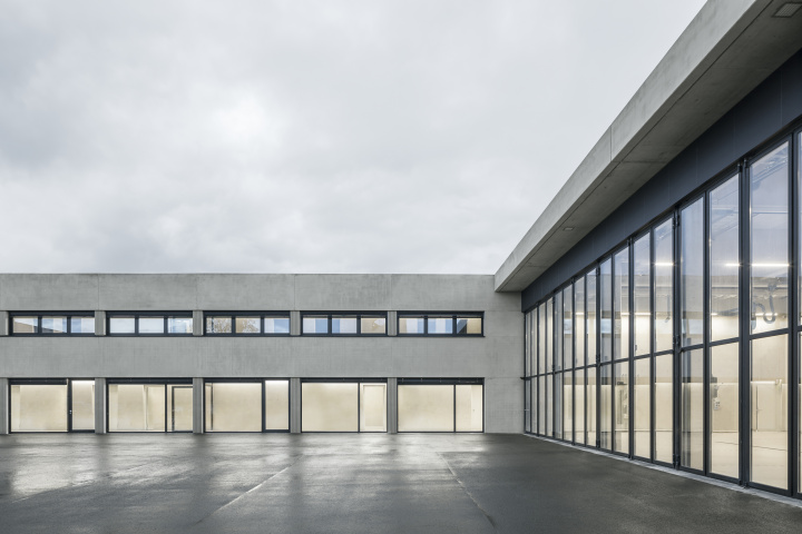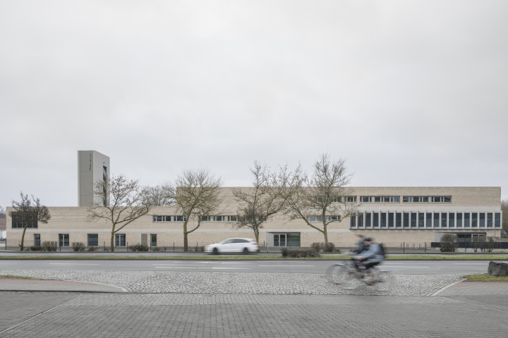 Die unterschiedlichen Gebäudeteile und der Schlauchturm werden durch eine einheitliche Materialität zu einer Gesamtanlage zusammengefasst. Einen spannungsreichen Kontrast bilden die großflächigen geschlossenen Wandflächen zu den Verglasungen der Fenster- und Torflächen.