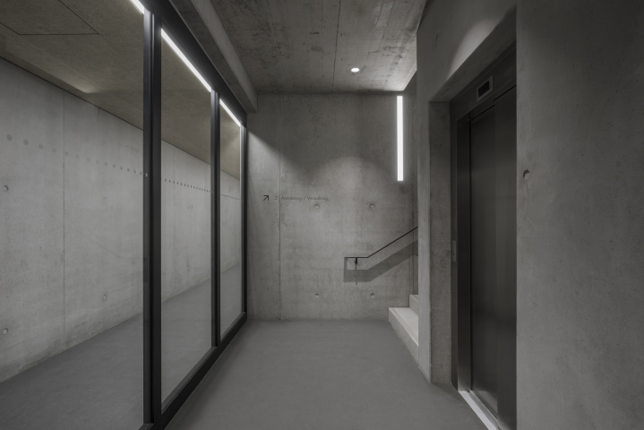 Die Leitstelle am Kopfende des Gebäudes bietet einen ungehinderten Blick auf den Knotenpunkt der Zu- und Ausfahrten sowie die Straßenkreuzung. Im 1. Obergeschoss befinden sich die Aufenthalts- und Schulungsräume und die Räume der Berufs- und Freiwilligen Feuerwehr. Das 2. Obergeschoss nimmt die Räume der Verwaltung auf.
