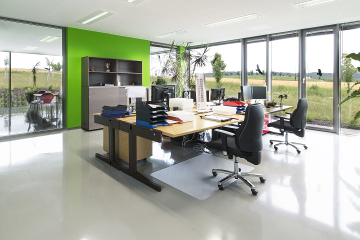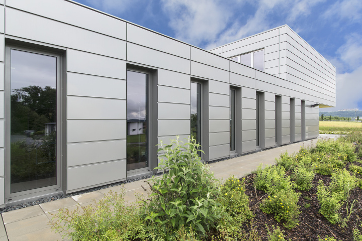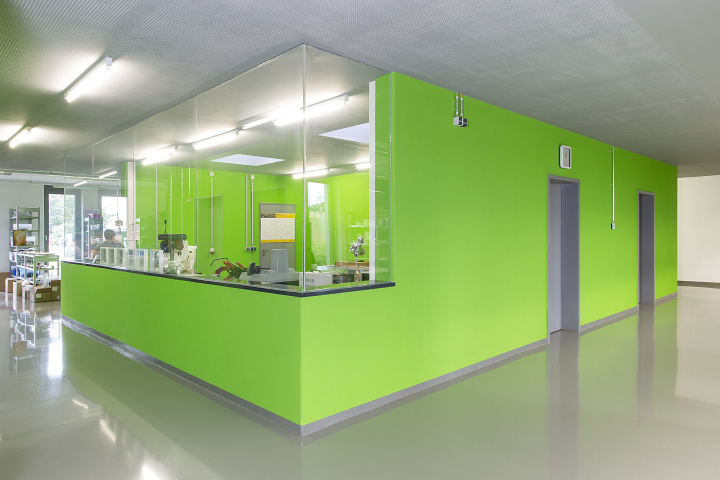 In exponierter Lage direkt an der Autobahnabfahrt entstand ein zum Teil zweigeschossiger Neubau, der speziell auf die funktionellen Abläufe im Unternehmen abgestimmt ist. Das Erdgeschoss gliedert sich in eine Anliefer-, Lager-, Produktions- und Verwaltungszone. Im ersten Obergeschoss ist neben der Firmenleitung eine interne Wohnung untergebracht.