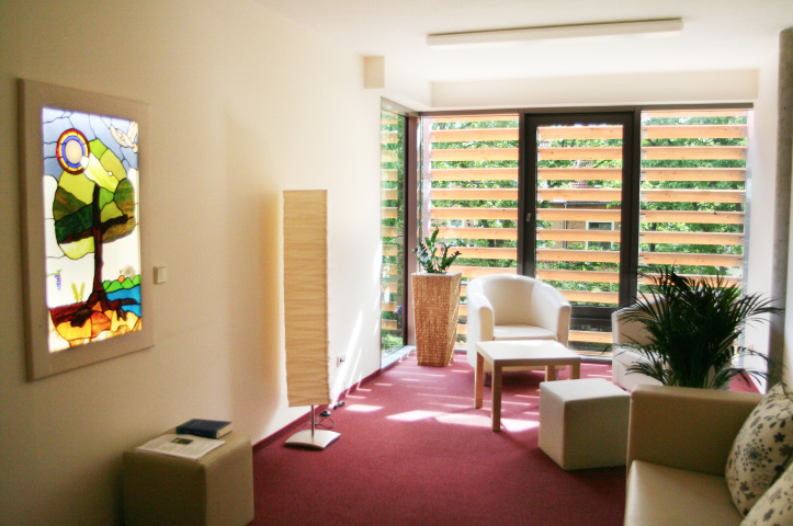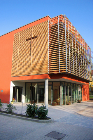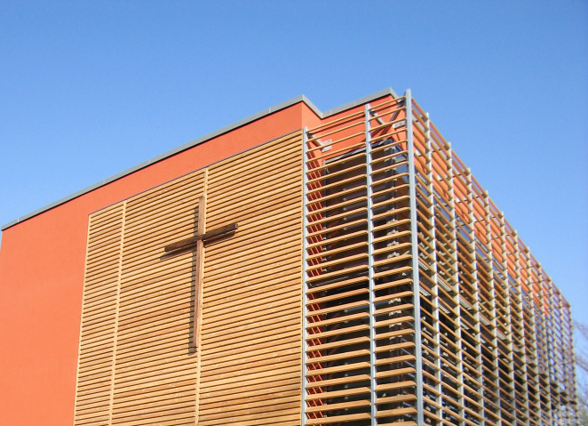 Markant prägt der Sonnenschutz vor den Obergeschossen die dahinter liegenden Räume. In der Fernwirkung geschlossene Lamellenstrukturen lösen sich beim Näherkommen zu einem linearen Netz neben der Lärchenbrettschalung mit dem schlichtem Kreuz auf. Von fern ist die Christuskirche zu sehen.