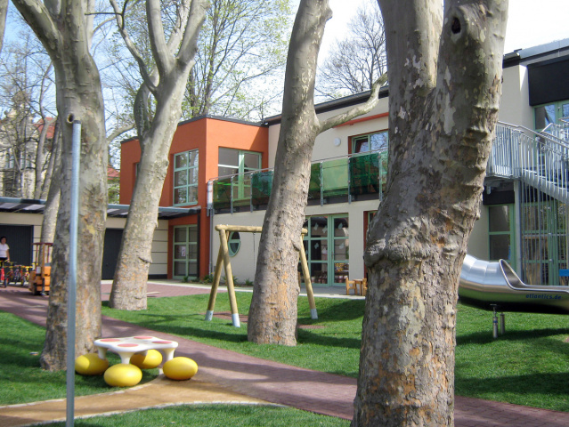 Die Integrative Kindertagesstätte „Senfkorn“ der Diakonie Ostthüringen telt sich ein gemeinsames Grundstück mit dem vor ca. 10 Jahren entstandenen Altenpflegeheim „Joliot-Curie-Haus“ in Gera. Zum Konzept des Trägers gehört die Integration behinderter Kinder und das generationsübergreifende Miteinander zwischen Alt und Jung. Das zweigeschossige Gebäude für 120 Kinder schmiegt sich zwischen einer Platanenallee und Polizeimauer harmonisch ein. Die zur Verfügung stehende Fläche wurde maximal ausgenutzt; durch das zurückgesetzte Obergeschoss wird hier eine großzügige Spielterrasse angeboten. Das Gebäude wurde als Passivhaus gebaut. Durch gute Luftdichtigkeit und hocheffizienter Lüftungsanlage wird ein sehr gutes Raumklima geschaffen. Über Rotationswärmetauscher wird eine 80 %ige Wärmerückgewinnung erzielt. Die Luftmengensteuerung erfolgt über CO²-Sensoren. Der Heizwärmebedarf mit nur 15 kWk/m² führt zu sehr geringen Betriebskosten. Das Haus wurde nach einjähriger Bauzeit in Betrieb genommen.