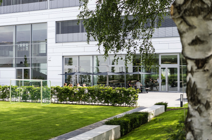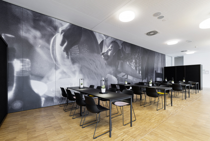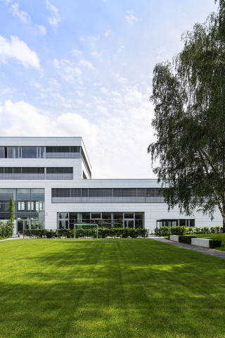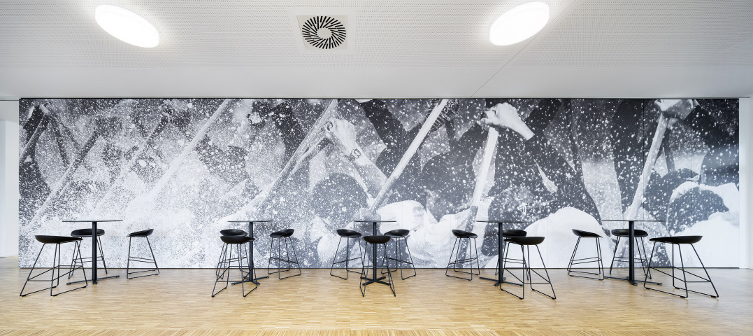 Das Herzstück des mit rund 5.000 m² Nutzfläche großen und viergeschossigen Gebäudes bildet die großzügige Freitreppe der modernen und hellen Eingangshalle. Sie bildet das Entrée zu dem im Erdgeschoss befindlichen Mitarbeiterrestaurant für 150 Personen und dem neuen Konferenzraum, der zu einem großen Veranstaltungsbereich für rund 300 Mitarbeiter verbunden werden kann.
