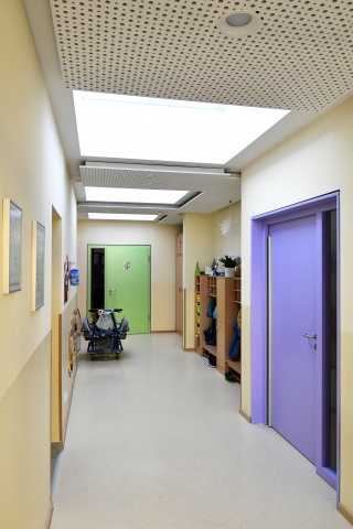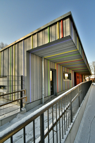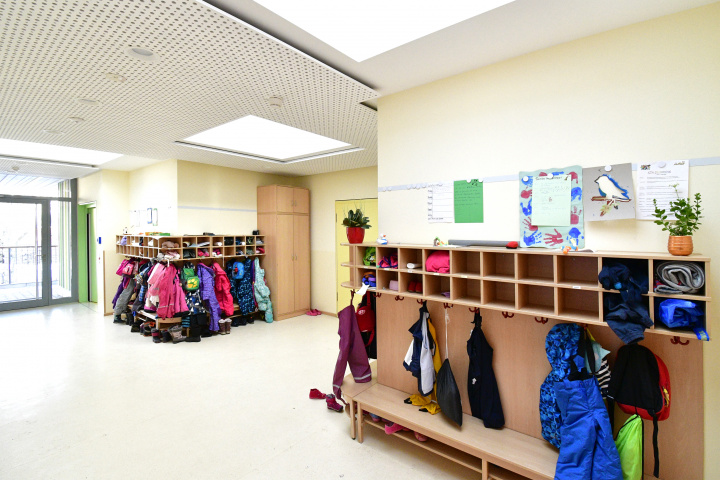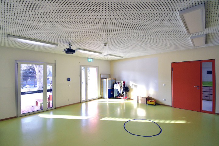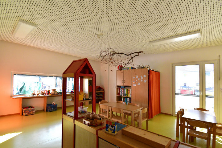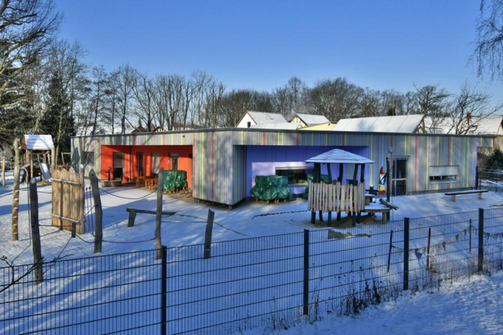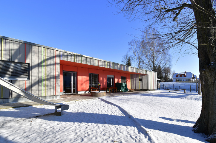 Der Kindergarten ersetzt den Vorgängerbau aus den 1930er Jahren, der aufgrund der heutigen statischen Anforderungen nicht mehr erweiterbar war. Der eingeschossige Neubau unterteilt sich in Kindergrippe und -garten mit jeweils eigenem Zugang und bietet Platz für mehr als 40 Kinder. Alle Gruppenräume und der Mehrzweckraum haben vorgelagerte Terrassen mit Ausgängen unmittelbar in den Außenbereich. Dies soll dem pädagogischen Modell folgend, den Bezug der Kinder zur Umwelt schärfen. Dementsprechend wurde das Gebäude vorrangig aus nachwachsenden Rohstoffen, auch durch die markante Holzschalung als Fassadenbekleidung ablesbar, errichtet. Die Bauzeit konnte durch die gewählte Fertigteil-Bauweise als Holzrahmenkonstruktion auf 11 Monaten verkürzt werden.
