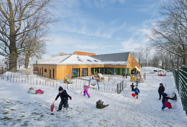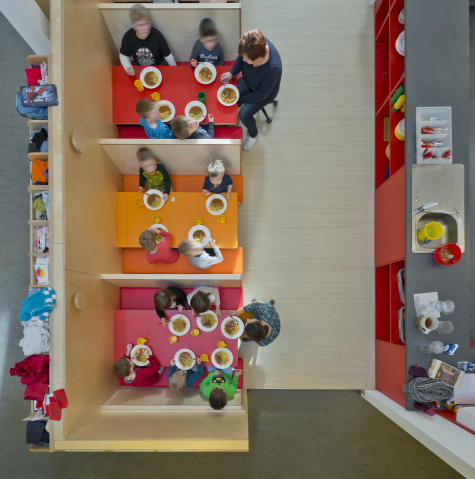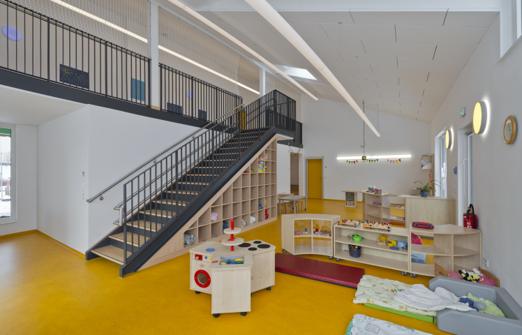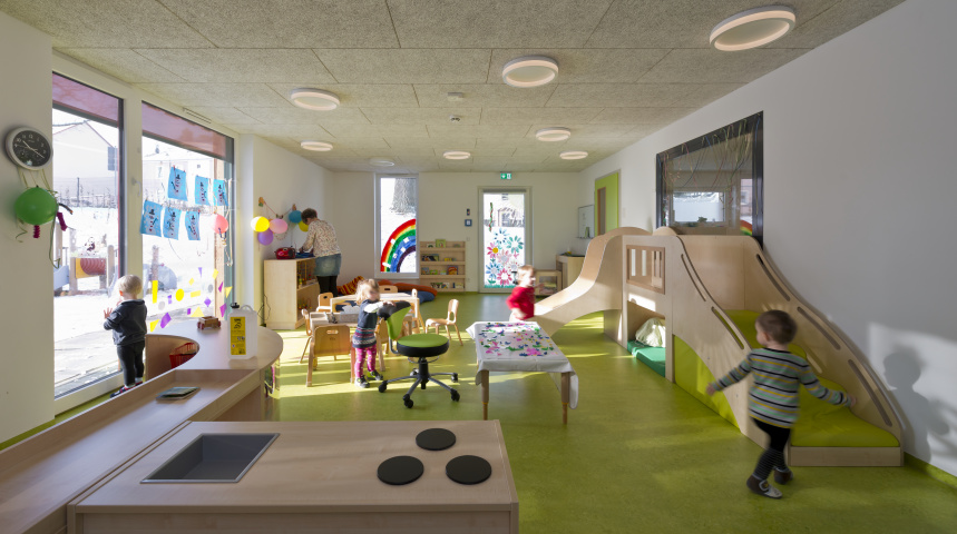 Im Inneren sind vier Gruppenräume um den „Marktplatz“ mit dem Kinderrestaurant angeordnet, der mit seiner sich in den Garten öffnenden Fassade viel Licht und Raum für das gemeinsame Spielen der Kinder, aber auch für die Kommunikation zwischen Eltern und Betreuern bietet.