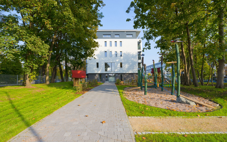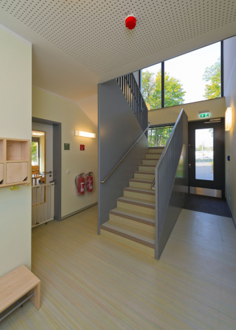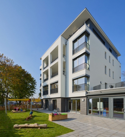 So entstand eine zweigeschossige Kindertagestätte für 120 Kinder in zwei Geschossen und darüber befinden sich 10 Eigentumswohnungen im KfW 40-Standard. Das Gebäude besitzt eine Tiefgarage mit 12 Stellplätzen. Der Krippenbereich im Erdgeschoss besitzt einen direkten Zugang zu den Spielflächen, der Kita-Bereich besitzt eine Dachterrasse. Eine große Spielfläche wurde auf Grund der beengten Situation seitlich des Gebäudes vorgesehen. Die äußere Gestalt des Hauses richtet sich nach den strikten Vorgaben des B-Planes. Das Dachgeschoss wurde mit Fassadenpaneelen, das Erdgeschoss mit Keramikverblendung verkleidet. Im Gebäude wurden Fenster aus Holz mit außenliegendem Sonnenschutz als Raffstore verwendet.