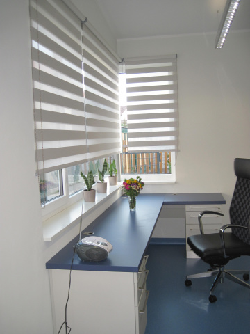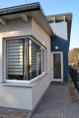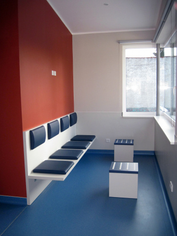 Im Straßenraum fällt das Gebäude durch seine kräftig blaue Farbgebung der Fassade mit dem kontrastierenden Schriftzug aus Edelstahl auf. Parkplätze für Patienten befinden sich in ausreichender Zahl auf dem Grundstück.