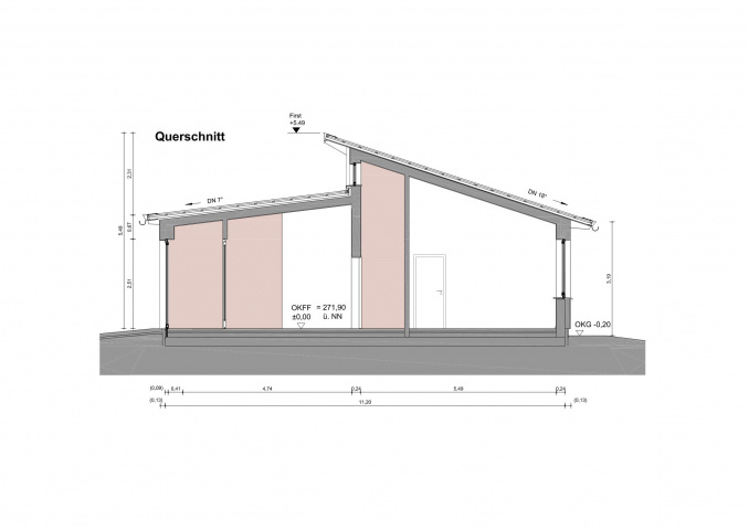 Um sich der Geschossigkeit der benachbarten Gebäuden städtbaulich anzunähern, wurde der eingeschossige Baukörper in Längsrichtung in zwei höhenversetzte Gebäudeteile mit gegenläufigen Pultdächern gegliedert, wodurch auch der innenlegende Flur über ein Oberlichtband optimal belichtet wird.