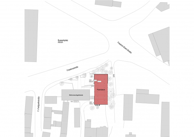 Im Zuge der Sanierung des Mehrzweckgebäudes in der Friedensstraße 42 in Weimar sollte die begrenzte Stellplatzanzahl auf dem Grundstück durch den Bau eines Parkdecks auf ein zeitgemäßes Maß erhöht werden. Obgleich es sich um einen reinen Funktionsbau handelt, soll das Gebäude, aufgrund seiner Lage an einem Verkehrsknotenpunkt am Rande der Altstadt, mit einfachen Mitteln gestalterischem Anspruch genügen ohne sich dabei in den Vordergrund zu spielen. Das untere Deck wurde daher in Beton ausgeführt und teilweise ins Gelände eingegraben . Das obere Deck erhielt umlaufend eine Verkleidung aus silbergrauen Aluminiumlamellen.