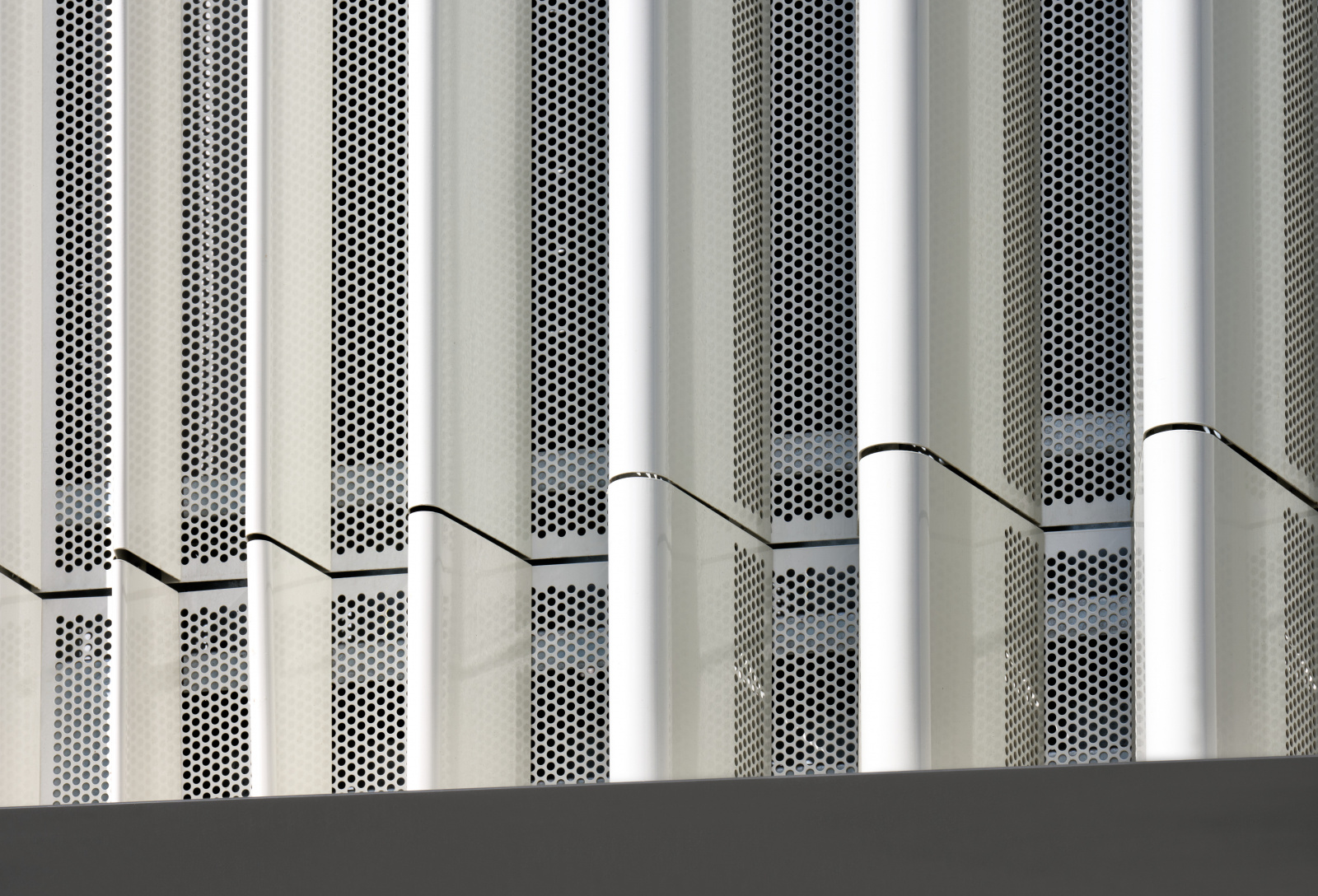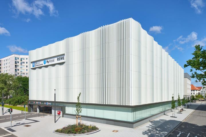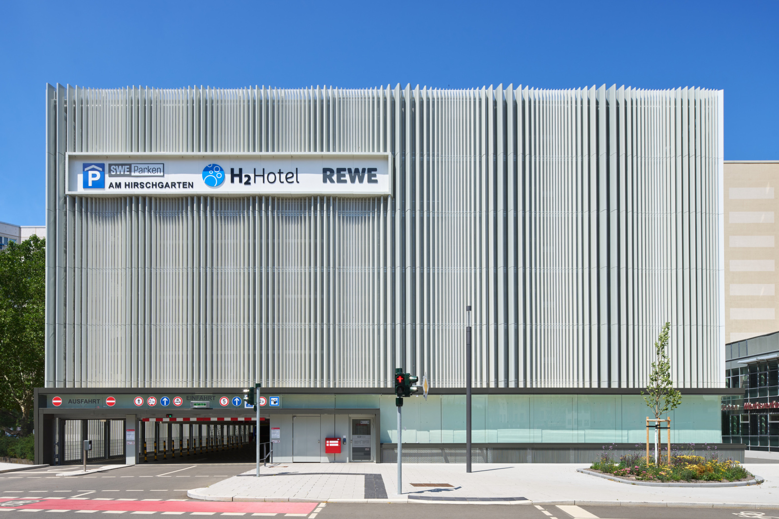 Die Einzelelemente stehen rechtwinklig vom Gebäude ab und reihen sich so zu einem Vorhang auf. Diese klare Struktur wirkt einerseits sehr ruhig, erzeugt jedoch andererseits durch den im Tagesverlauf stetig wechselnden Lichteinfall ein ständig verifiziertes Bild und erscheint dadurch trotz ihrer Klarheit wohltuend lebendig. Die Lisenen sind beidseitig bildhaft gestaltet, wodurch aus verschiedenen Blickwinkeln für den Betrachter unterschiedliche Bilder signifikanter Stadtmotive auf der Fassade entstehen. Hinter ihnen schließt eine flache, perforierte, ruhige Fassadenstruktur die Gebäudehülle optisch klar ab. An der Süd-Westecke und auf der Nordseite des Parkhauses dominiert bis zum jeweiligen Treppenhaus eine gefaltete Gebäudehülle der gleicher Bauart die Gebäudeoptik. Von innen wirken diese beiden Fassadenstrukturen sehr offen, man hat einen allumfassenden Außenbezug. Die Elemente weisen somit einen nahezu hundertprozentig offenen Luftquerschnitt auf, der zur ausreichenden Querlüftung und Entrauchung des Parkhauses dient. Von außen hingegen erzeugt die Fassade den geschlossenen kompakten Charakter des Baukörpers. Somit entsteht eine klare Körperhaftigkeit, die das störende Innenleben bewußt aus dem Straßenraum entfernt. Die einzelnen Fassadenelemente haben 6 unterschiedliche aufeinander abgestimmte Farbnuancen, welche durch die von Etage zu Etage bewusst verschobene Anordnung ein sanftes Schwingen auf der Gesamtfassade erzeugen. Die horizontale Gliederung in der Ebene der einzelnen Geschossdecken unterstreicht diese Wirkung zusätzlich. Die matte Oberfläche nimmt den Elementen die sonst auf ihnen zu erwartende Spiegelung und erzeugt somit eine hohe optische Wertigkeit.