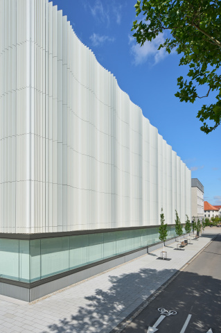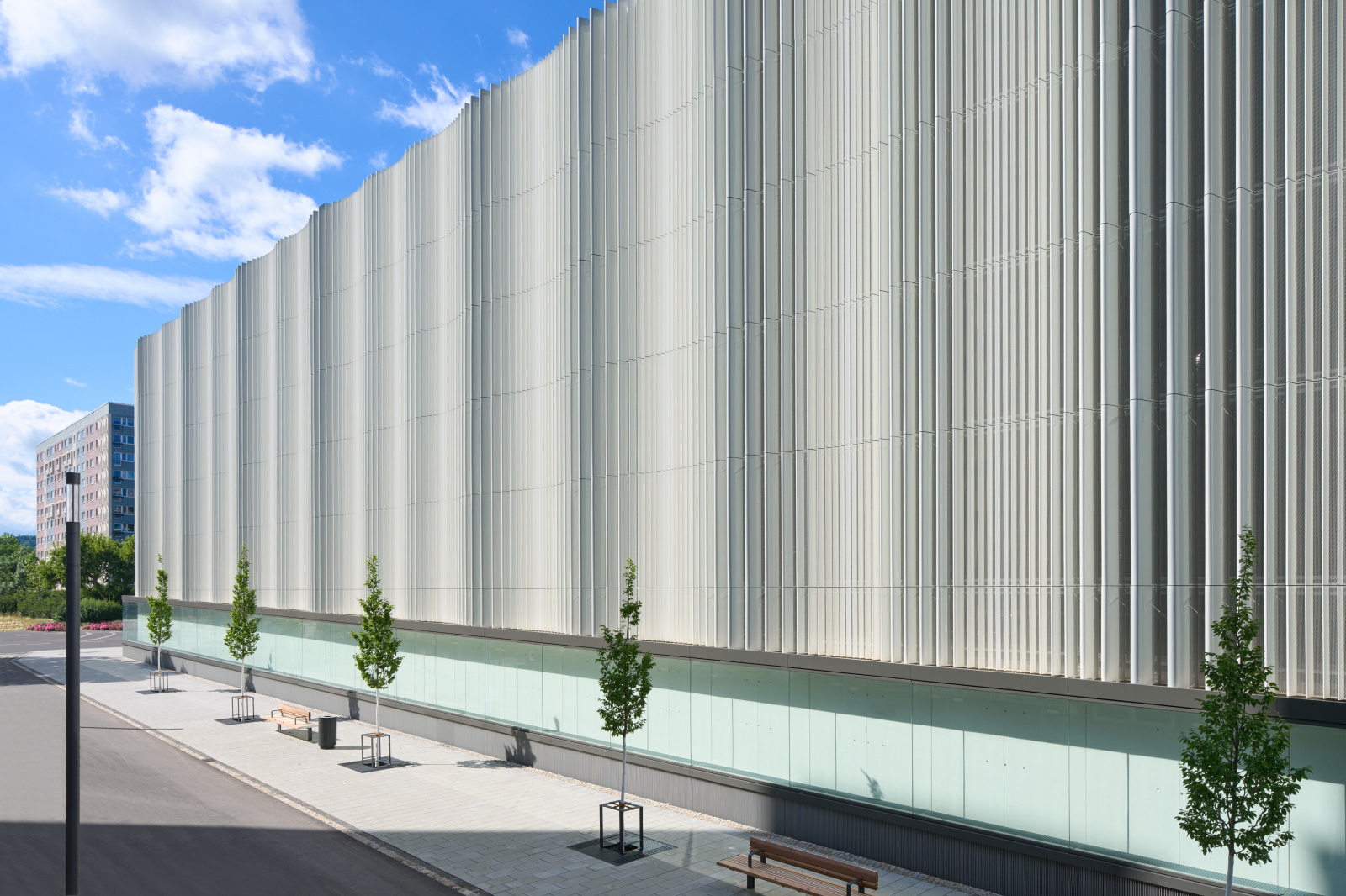 Das Dach ist als Gründach konzipiert, was den Blick aus den oberen Etagen der 12-geschossigen benachbarten Wohnbebauung in den Stadtraum signifikant aufwertet und zusätzlich nachhaltig zur Verbesserung des innerstädtischen Mikroklimas beiträgt.