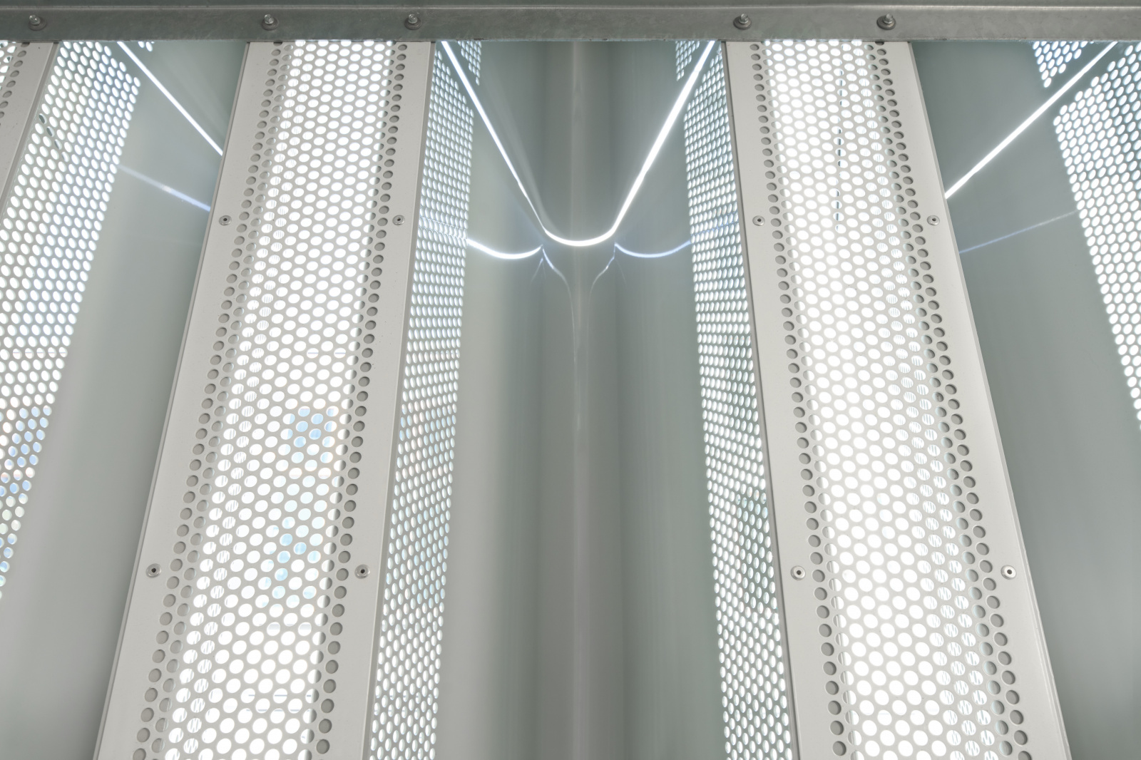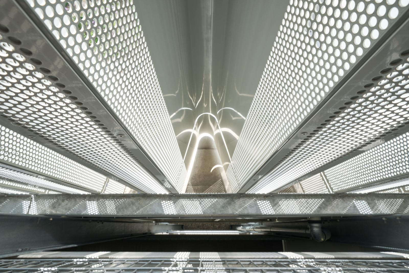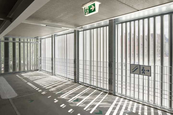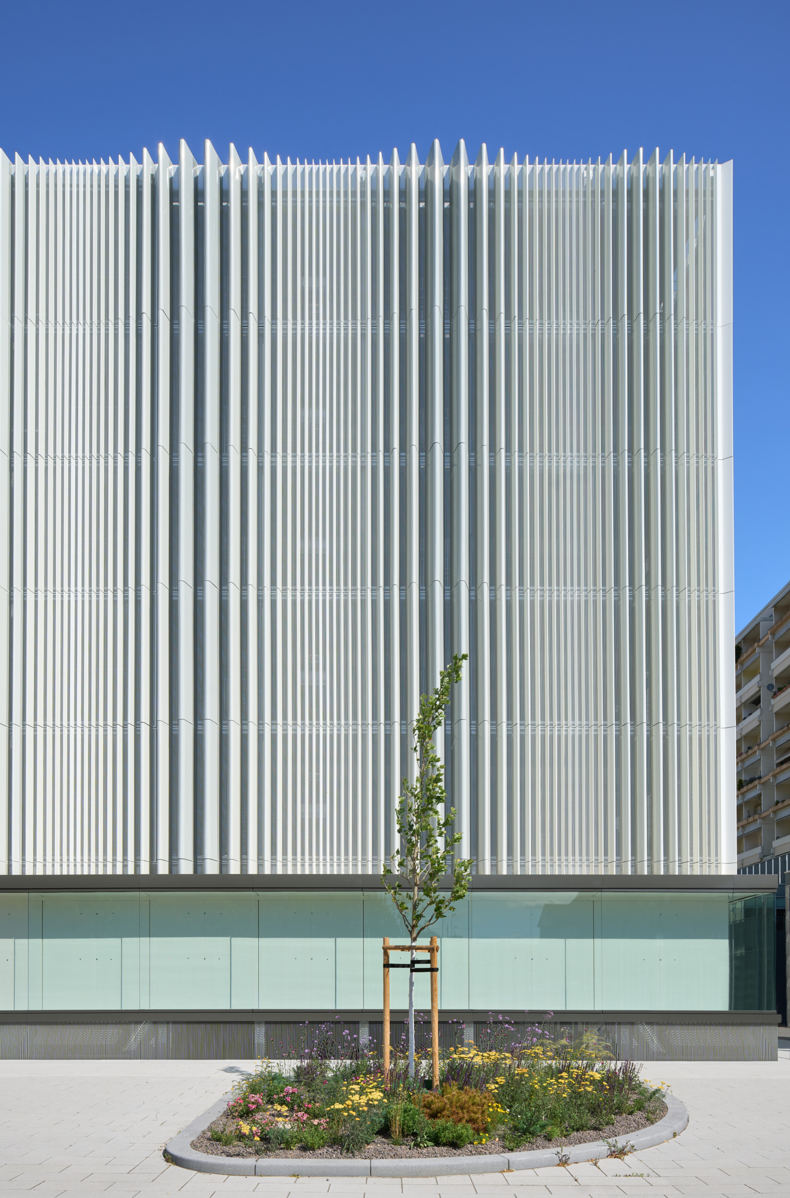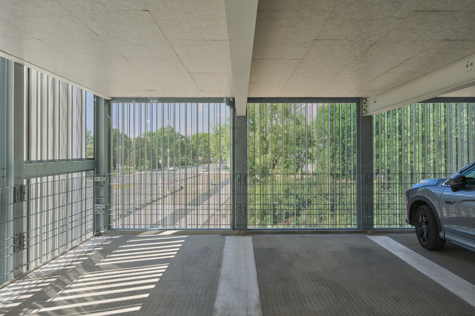 Die sachliche aber dennoch spannungsreiche Fassade des Parkhauses formuliert eine ruhige, klare Antwort auf die Architektur der vielfältigen benachbarten Bebauung. Sie nimmt sich in ihrer Formgebung zurück und baut durch die gewählten Oberflächenmaterialien eine wohl dosierte Spannung zur Nachbarbebauung auf. Es soll eine Anmutung transportiert werden, die technische Funktionalität und Würde verbindet. Ein Haus, das seine Aufgabe klar zeigt, aber zugleich eine feine, urbane Haltung wahrt. Eine Fassade, die nicht nur Hülle ist, sondern Resonanzfläche – für Licht, Bewegung und Stadt. Die äußere Hülle wird von einer vertikal über alle Obergeschossetagen stehenden lisenenartigen Struktur geprägt. Die Einzelelemente reihen sich aneinander zu einem Vorhang auf. Es wird durch den im Tagesverlauf stetig veränderten Lichteinfall ein feines wechselndes Bild von Licht und Schatten erzeugt, die Gebäudehülle erscheint damit wohltuend lebendig. Die einzelnen aufeinander abgestimmte Farbnuancen erzeugen zusätzlich ein sanftes Schwingen auf der Fassade und somit aus verschiedenen Blickwinkeln unterschiedliche Oberflächeneindrücke.